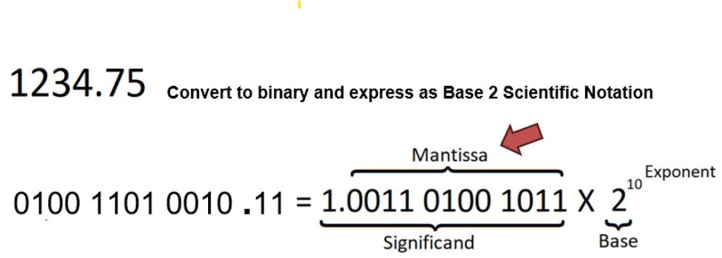 23 bits are assigned to hold compressed details of the number that is known as the Mantissa. The Mantissa is also a component of a number when it is expressed in this Base 2 version of scientific notation.